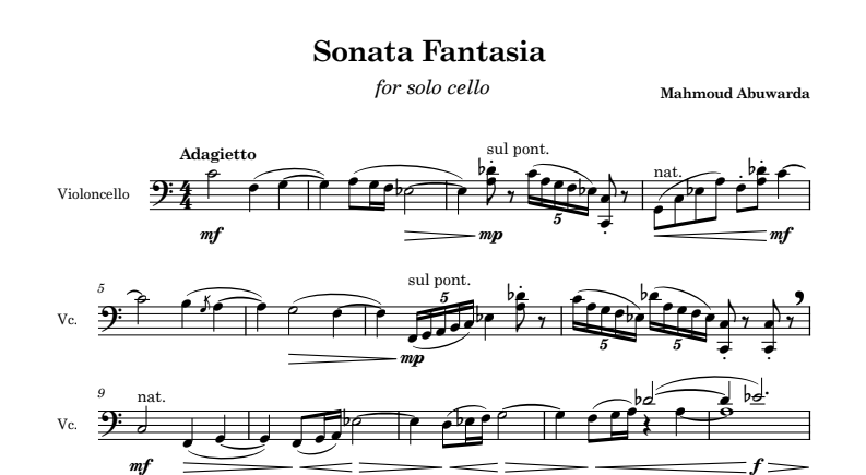 In Sonata Fantasia for solo cello, composed specifically for the JERUS-IT-ARTS project, the author explores the cello as a meeting point between different traditions, in a work composed specifically for the JERUS-IT-ARTS contest. The work blends Western classical structure with melodic and rhythmic inflections inspired by Eastern musical traditions, treating the latter not as literal quotations but as an integral part of the musical fabric.